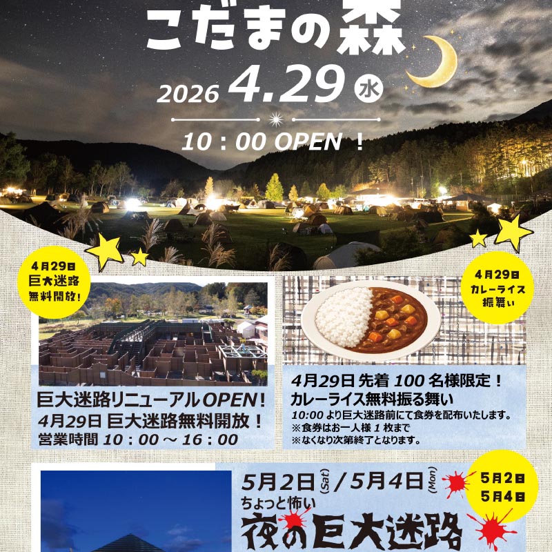 【2026シーズン ご予約受付開始日のご案内】こだまの森は 4月29日 OPEN 予定です。各月のご予約受付開始日は、以下の通りです。・4月・5月分:2月18日(水) 午前8:30~・6月分:3月16日(月) 午前8:30~・7月分:4月15日(水) 午前8:30~・8月分:5月20日(水) 午前8:30~ご予約は WEB予約のみとなります。あらかじめご了承くださいますよう、お願いいたします。皆さまのご予約を心よりお待ちしております。