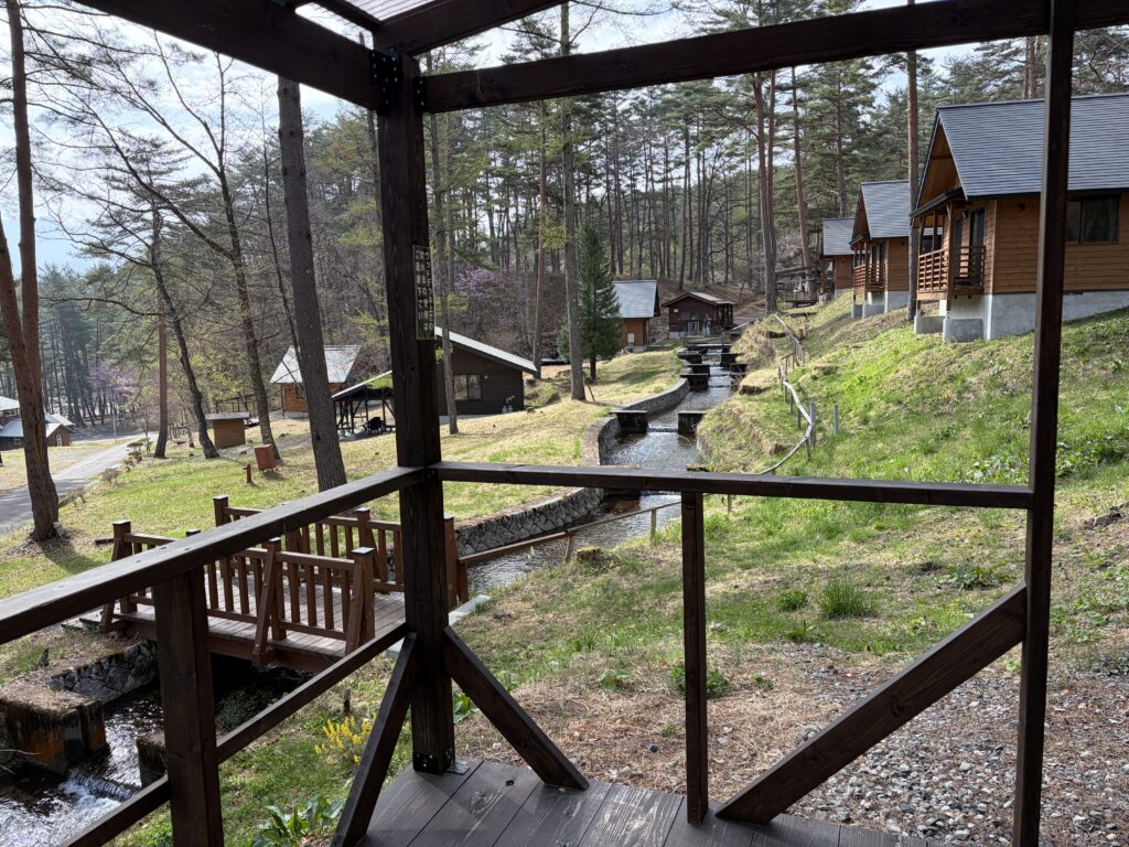 キャビンのウッドテラスからの眺めがいい感じです。ゆったりとした時間を過ごせそうです。